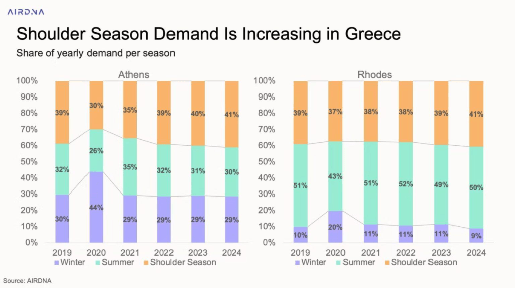 This gradual smoothing of seasonality is clear in Athens, where mid-season demand rose from 39% in 2019 to 41% in 2024, as summer’s share fell from 32% to 30%. Rhodes shows a similar pattern, with mid-season demand increasing from 39% to 41%.