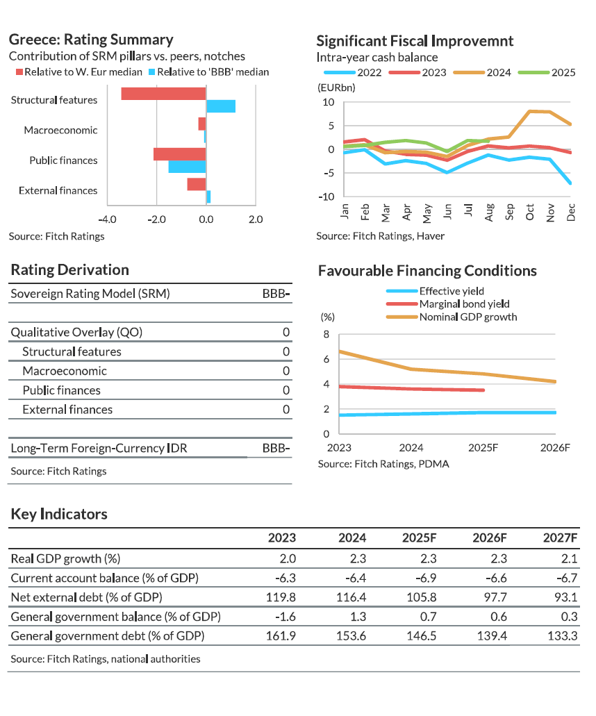 Το δημοσιονομικό ισοζύγιο συγκρίνεται επίσης θετικά με το μεσαίο όριο του ‘BBB’ που είναι το 3,7%. Η Fitch αναμένει δημοσιονομικά πλεονάσματα πάνω από 2,5% του ΑΕΠ για την περίοδο 2025-2027.