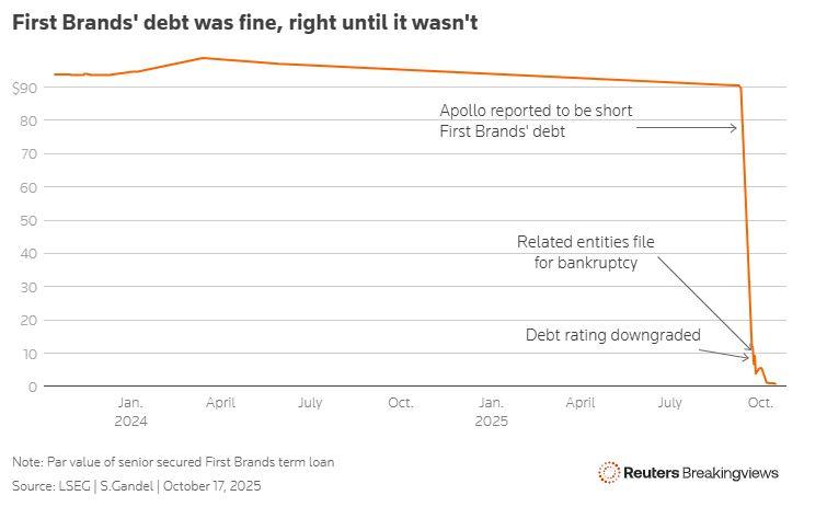 Απλώς κοιτάξτε πώς τιμολογείται ο κίνδυνος. Ακόμα και όταν ο κατασκευαστής ανταλλακτικών αυτοκινήτων First Brands, ίσως το πιο εντυπωσιακό χάος των τελευταίων εβδομάδων, οδεύει προς την αθέτηση πληρωμών, τα δάνειά του διαπραγματεύονταν σε πάνω από 90 σεντς ανά δολάριο. Όταν αθέτησε τις υποχρεώσεις πληρωμών τον τοίχο τον Σεπτέμβριο, κατέρρευσαν ξαφνικά. Το ίδιο ισχύει και για τα μη ρευστοποιήσιμα δάνεια: οι ιδιώτες δανειστές έχουν χαρακτηρίσει το χρέος που συνδέεται με εταιρείες με υψηλή μόχλευση σε υγιή επίπεδα, μέχρι που εξερράγησαν.