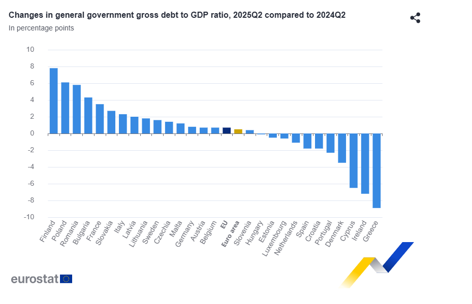 Σε σύγκριση με το πρώτο τρίμηνο του 2025, δεκαπέντε κράτη μέλη κατέγραψαν αύξηση του λόγου χρέους προς ΑΕΠ στο τέλος του δεύτερου τριμήνου του 2025 και δώδεκα κατέγραψαν μείωση. Οι μεγαλύτερες αυξήσεις του λόγου παρατηρήθηκαν στη Φινλανδία (+4,3 ποσοστιαίες μονάδες – ποσοστιαίες μονάδες), τη Λετονία (+2,7 ποσοστιαίες μονάδες), τη Βουλγαρία (+2,6 ποσοστιαίες μονάδες), την Πορτογαλία (+1,8 ποσοστιαίες μονάδες), τη Γαλλία (+1,7 ποσοστιαίες μονάδες) και τη Ρουμανία (+1,4 ποσοστιαίες μονάδες). Οι μεγαλύτερες μειώσεις καταγράφηκαν στη Λιθουανία (-1,4 ποσοστιαίες μονάδες), την Ιρλανδία (-1,2 ποσοστιαίες μονάδες), την Ελλάδα και το Λουξεμβούργο (και οι δύο -1,1 ποσοστιαία μονάδα).