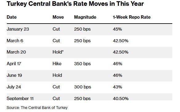 Η συντριπτική πλειονότητα των 23 οικονομολόγων που συμμετείχαν σε έρευνα του Bloomberg αναμένει ότι η κεντρική τράπεζα θα μειώσει το κόστος δανεισμού, με τη μέση εκτίμηση να δείχνει μείωση 100 μονάδων βάσης στο 39,5%.