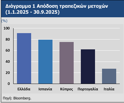 Η ενίσχυση των ισολογισμών, αλλά και ένα ευνοϊκό μακροοικονομικό περιβάλλον, είναι κατά την Τράπεζα της Ελλάδος, οι δύο λόγοι της εντυπωσιακής υπεραπόδοσης των ελληνικών τραπεζικών το εννεάμηνο του 2025, καθώς η βελτίωση της εμπιστοσύνης των επενδυτών στις προοπτικές τόσο του κλάδου όσο και της χώρας οδήγησαν στις αυξημένες μετοχικές αποδόσεις, οι οποίες έφτασαν ακόμη και το 90%.