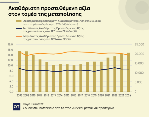 Παρά την πρόοδο που έχει σημειωθεί το ΚΕΠΕ αναφέρει πως το μεγάλο χάσμα που εξακολουθεί να χωρίζει την Ελλάδα από τον μέσο όρο της ΕΕ, σε ό,τι αφορά το ποσοστό συμμετοχής του μεταποιητικού τομέα στην οικονομική δραστηριότητα. Σύμφωνα με τα δεδομένα αυτά, το μερίδιο της Ακαθάριστης Προστιθέμενης Αξίας της μεταποίησης στο ΑΕΠ ανήλθε στο 8,7% για την Ελλάδα έναντι 14% κατά μέσο όρο στην ΕΕ το έτος 2024, πράγμα που σημαίνει ότι ο βιομηχανικός τομέας της ελληνικής οικονομίας θα πρέπει να αναπτυχθεί με γρήγορους ρυθμούς τα επόμενα χρόνια, προκειμένου η συμμετοχή του στην οικονομική δραστηριότητα να συγκλίνει με τα ευρωπαϊκά πρότυπα.