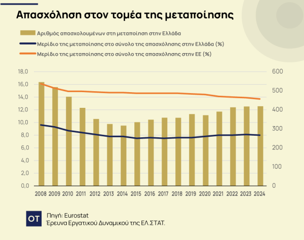 Ο αριθμός των απασχολουμένων στη μεταποίηση κατέγραψε σημαντική άνοδο στην περίοδο από το 2015 και μετά, αριθμώντας τα 418 χιλ. άτομα το έτος 2024 από μόλις 325 χιλ. το 2013.