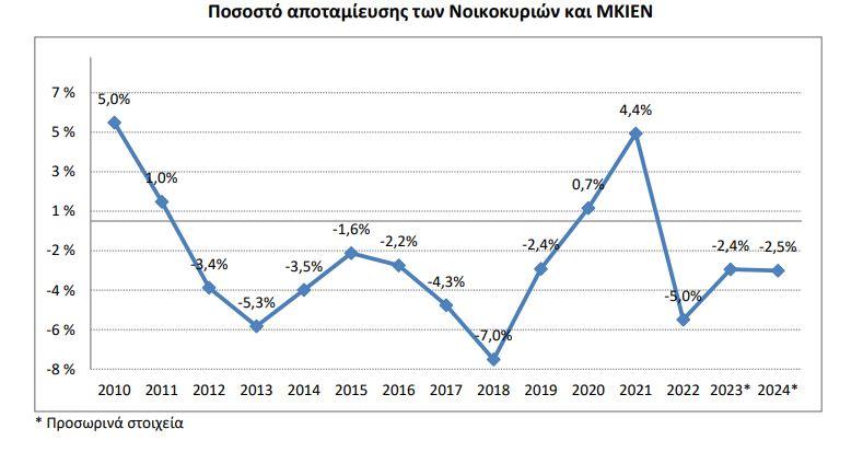 Την ίδια ώρα, ωστόσο, το ποσοστό αποταμίευσης των νοικοκυριών και των ΜΚΙΕΝ (η ακαθάριστη αποταμίευση προς το ακαθάριστο διαθέσιμο εισόδημα) ήταν -2,5% έναντι -2,4% το 2023.