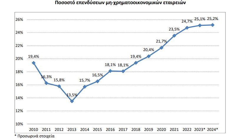 Το ποσοστό των επενδύσεων των μη χρηματοοικονομικών εταιρειών, που ορίζεται ως ο ακαθάριστος σχηματισμός παγίου κεφαλαίου προς την ακαθάριστη προστιθέμενη αξία ήταν 25,2% το 2024 σε σύγκριση με 25,1% το 2023.