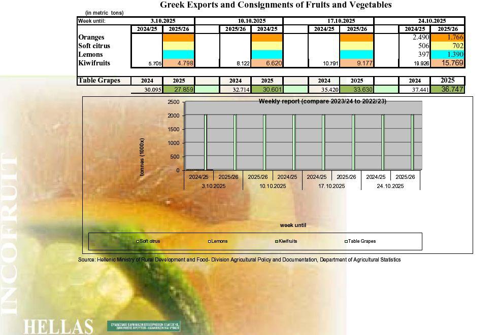 Οι εξαγωγές ακτινιδίων από 1/9/2025 έως και 24/10/2025 ανέρχονται σε 15.769 τόνους (μείωση κατά 21%) έναντι 19.926 τόνων το αντίστοιχο περσινό διάστημα 2024, με τους 2.659 τόνους να κατευθύνονται στη Βραζιλία, 1.550 τόνους στις ΗΠΑ, 637 τόνους στον Καναδά, 2.284 τόνους στην Ιταλία και 1.912 τόνους στην Ισπανία.