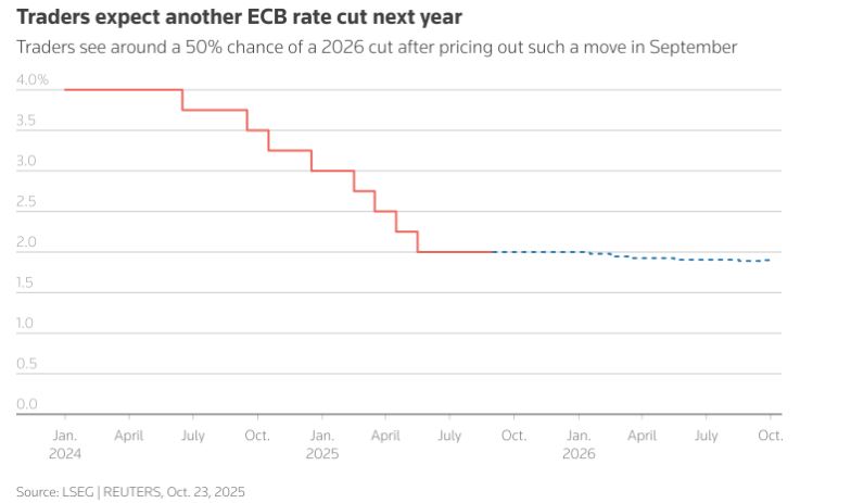 Οι αγορές χρήματος αξιολογούν μια πιθανότητα 50% για μια ακόμη μείωση των επιτοκίων της ΕΚΤ τον επόμενο χρόνο, αλλά τα στοιχεία που υποδηλώνουν ότι η οικονομία κερδίζει δυναμική στο τέταρτο τρίμηνο και οι αυξανόμενες τιμές του πετρελαίου έχουν μειώσει την πιθανότητα από περίπου 80% την περασμένη εβδομάδα.