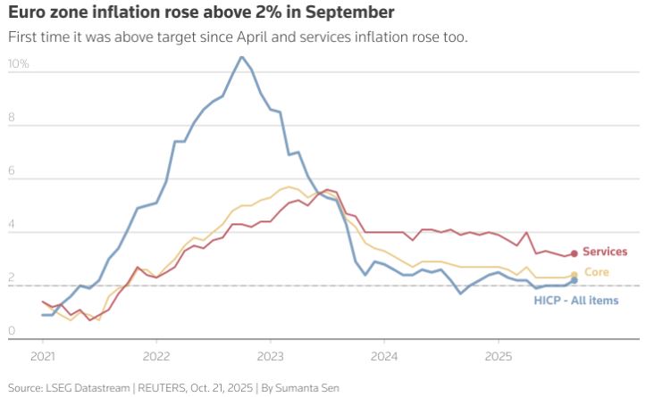 Όχι. Ο πληθωρισμός στην ευρωζώνη αυξήθηκε στο 2,2% τον Σεπτέμβριο, πάνω από τον στόχο για πρώτη φορά από τον Απρίλιο, καθώς οι τιμές των υπηρεσιών αυξήθηκαν και η μείωση του κόστους ενέργειας επιβραδύνθηκε.