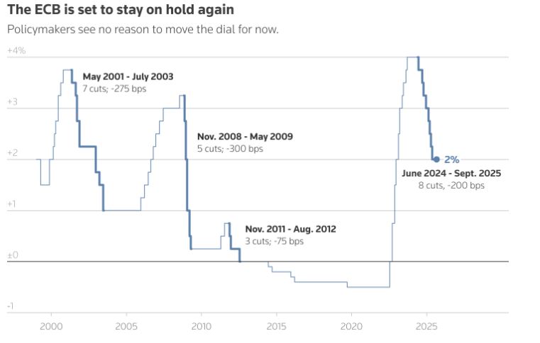 Δεν έχουν αλλάξει πολλά από τον Σεπτέμβριο, όταν οι υπεύθυνοι χάραξης πολιτικής δήλωσαν ότι η οικονομία της ευρωζώνης παρέμεινε σε «καλή κατάσταση». Δεν έχουν ακόμη δει τον πλήρη αντίκτυπο των αμερικανικών δασμών και το ευρώ, του οποίου η αύξηση κατά 12% φέτος μπορεί να μειώσει τον πληθωρισμό, έχει υποχωρήσει.