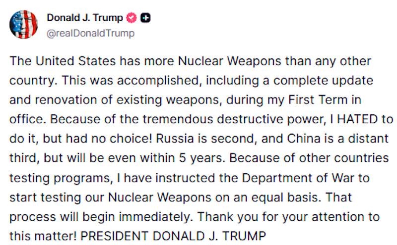 «Επειδή άλλες χώρες δοκιμάζουν προγράμματα, έχω δώσει εντολή στο Υπουργείο Πολέμου να ξεκινήσει τις δοκιμές των Πυρηνικών μας Όπλων σε ισότιμη βάση. Αυτή η διαδικασία θα ξεκινήσει αμέσως», δήλωσε ο Τραμπ.