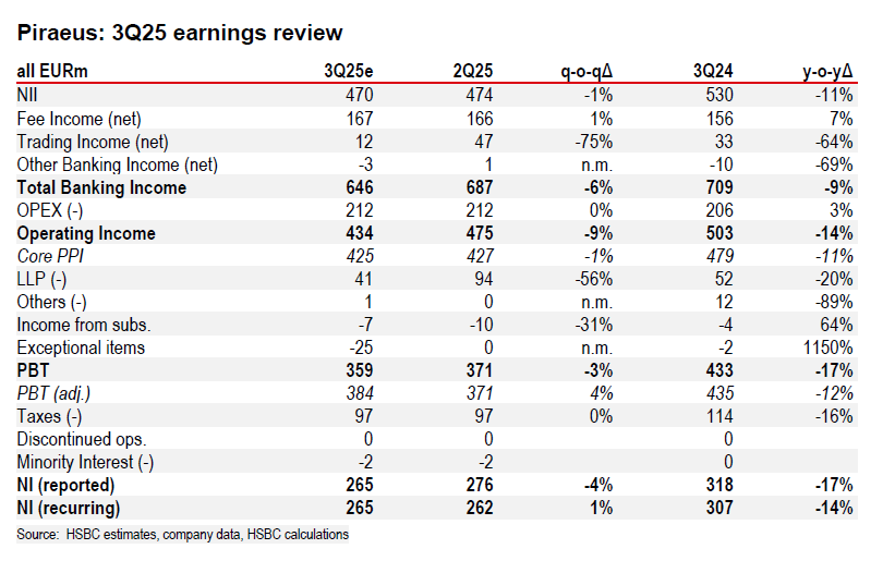 Η Τράπεζα Πειραιώς παραμένει η πιο ελκυστική επιλογή για την HSBC, με νέα τιμή στόχο τα 9,25 ευρώ (+26%) και σύσταση “Buy”. Η HSBC επισημαίνει ότι οι πρόσφατες εκδόσεις AT1 ύψους 1 δισ. ευρώ ενίσχυσαν τον δείκτη κεφαλαιακής επάρκειας κατά 110 μονάδες βάσης, επιτρέποντας υψηλότερες διανομές μερισμάτων (60% payout ratio).