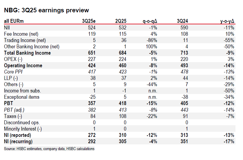Για την Εθνική Τράπεζα, η HSBC αυξάνει την τιμή στόχο στα 13,65 ευρώ (από 11,80 ευρώ) και διατηρεί τη σύσταση «Hold», επισημαίνοντας ότι η μετοχή έχει ήδη ενσωματώσει τις θετικές προσδοκίες για αυξημένα μερίσματα (άνω του 60% payout ratio).