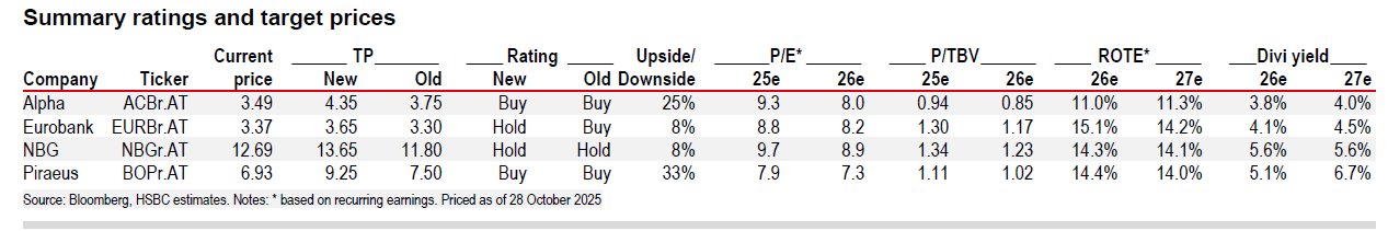 Η HSBC προχώρησε και σε αυξήσεις των τιμών στόχων, για την Alpha Bank στα 4,35 ευρώ, από 3,75 ευρώ προηγουμένως, με σύσταση για αγορά (buy), για την Eurobank στα 3,65 ευρώ, από 3,30 ευρώ, με σύσταση διακράτηση (hold), για την Εθνική στα 13,65 ευρώ, από 11,80 ευρώ, με σύσταση επίσης διακράτηση (hold) και για την Πειραιώς στα 9,25 ευρώ, από 7,50 ευρώ, με σύσταση για αγορά (buy). Πλέον ο κλάδος διαπραγματεύεται κατά μέσο όρο με P/E 8,1x και P/TBV 1,1x για το 2026, επίπεδα που προσεγγίζουν τον ευρωπαϊκό μέσο όρο.