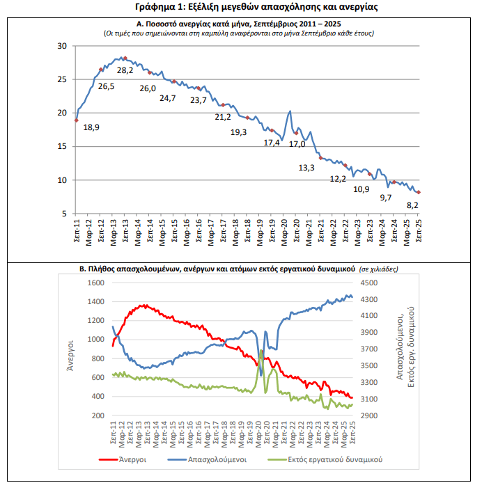 Ειδικότερα, όπως αναφέρεται σε σχετική ανακοίνωση, το εποχικά διορθωμένο ποσοστό ανεργίας τον Σεπτέμβριο του 2025 ανήλθε σε 8,2% έναντι 9,7% τον Σεπτέμβριο του 2024, και του αναθεωρημένου προς τα πάνω 8,2% τον Αύγουστο του 2025.