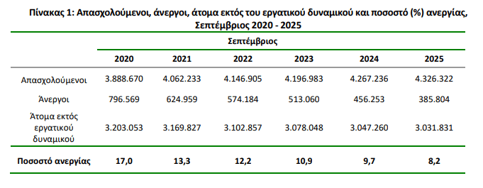 Οι άνεργοι ανήλθαν σε 385.804 άτομα σημειώνοντας μείωση κατά 70.449 άτομα σε σχέση με τον Σεπτέμβριο του 2024 (-15,4%) και μείωση κατά 384 άτομα σε σχέση με τον Αύγουστο του 2025 (-0,1%).