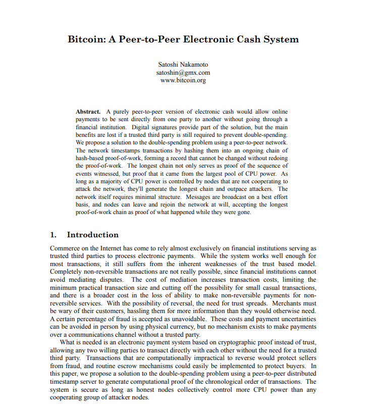 Το έγγραφο, με τίτλο «Bitcoin: Ένα ηλεκτρονικό σύστημα μετρητών Peer-to-Peer», περιέγραφε ένα αποκεντρωμένο δίκτυο peer-to-peer ικανό να αποτρέψει τις διπλές δαπάνες μέσω συναίνεσης για την απόδειξη εργασίας (PoW).
