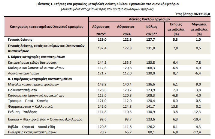 Αύξηση της τάξης του 5,3% κατέγραψε ο Γενικός Δείκτης Κύκλου Εργασιών για το λιανικό εμπόριο τον Αύγουστο του 2025, εν συγκρίσει με τον αντίστοιχο μήνα ένα χρόνο νωρίτερα, όπως ανακοίνωσε η Ελληνική Στατιστική Αρχή (ΕΛΣΤΑΤ). Σύμφωνα με τα ίδια στοιχεία, ο δείκτης συγκρινόμενος με τον Ιούλιο του 2025, ενισχύθηκε κατά 1%.