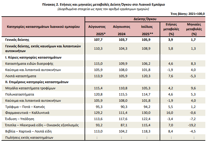 Από την άλλη, ο Γενικός Δείκτης Όγκου (κύκλος εργασιών σε σταθερές τιμές), κατά τον μήνα Αύγουστο 2025, σε σύγκριση με τον αντίστοιχο δείκτη του Αυγούστου 2024, παρουσίασε αύξηση 3,9% και σε σύγκριση με τον αντίστοιχο δείκτη του Ιουλίου 2025 αύξηση 1,7%.