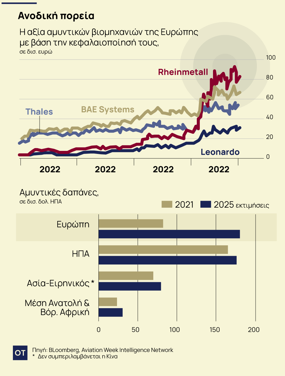 Οι αξίες άλλων μεγάλων ευρωπαϊκών αμυντικών βιομηχανιών, όπως η βρετανική BAE Systems, η γαλλική Thales και η ιταλική Leonardo, έχουν επίσης εκτοξευθεί (βλ. διάγραμμα 1).