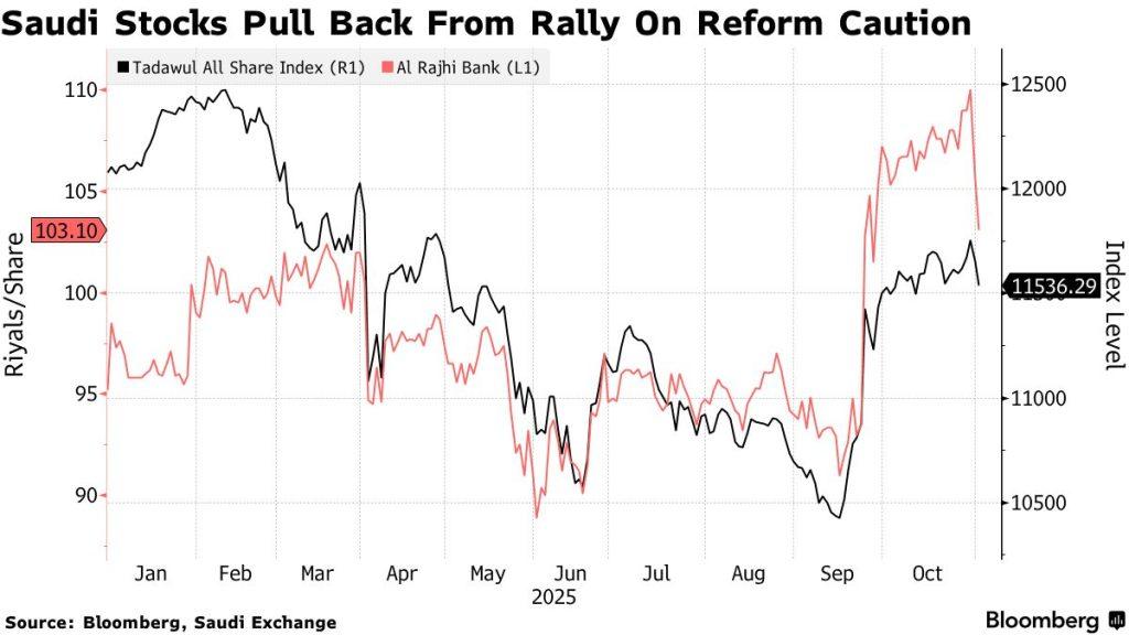 Ο δείκτης Tadawul All Share Index υποχώρησε κατά 1% την Κυριακή, σημειώνοντας τη δεύτερη συνεχόμενη ημέρα πτώσης. Οι τράπεζες ήταν οι δεύτερες μεγαλύτερες χαμένες, με την Al Rajhi Bank να καταγράφει πτώση στο χαμηλότερο επίπεδο των τελευταίων πέντε εβδομάδων. Οι εταιρείες, συμπεριλαμβανομένης της Al Rajhi, είχαν σημειώσει άνοδο λόγω των προσδοκιών ότι η ρυθμιστική αρχή θα χαλάρωνε τους κανόνες πριν από το τέλος του 2025, επιτρέποντας στους διεθνείς επενδυτές να κατέχουν ποσοστό άνω του 49% σε σαουδικές εταιρείες.