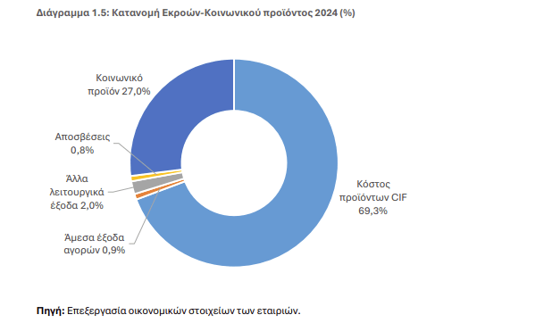 Το κοινωνικό προϊόν του κλάδου εμπορίας πετρελαιοειδών το 2024 διαμορφώθηκε σε 4,04 δισ. ευρώ , καθώς οι εξεταζόμενες εταιρίες δημιούργησαν για τον κρατικό προϋπολογισμό έσοδα από φόρους και άλλες
