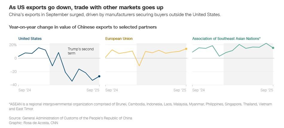 Ωστόσο, παρά την απότομη πτώση του εμπορίου με τις ΗΠΑ, οι κινεζικές εξαγωγές αυξήθηκαν κατά 6,1% φέτος, με τα στοιχεία του Σεπτεμβρίου να δείχνουν αύξηση 8,3% σε σύγκριση με το προηγούμενο έτος, καθώς οι εξαγωγές προς άλλες περιοχές σημείωσαν άνοδο.