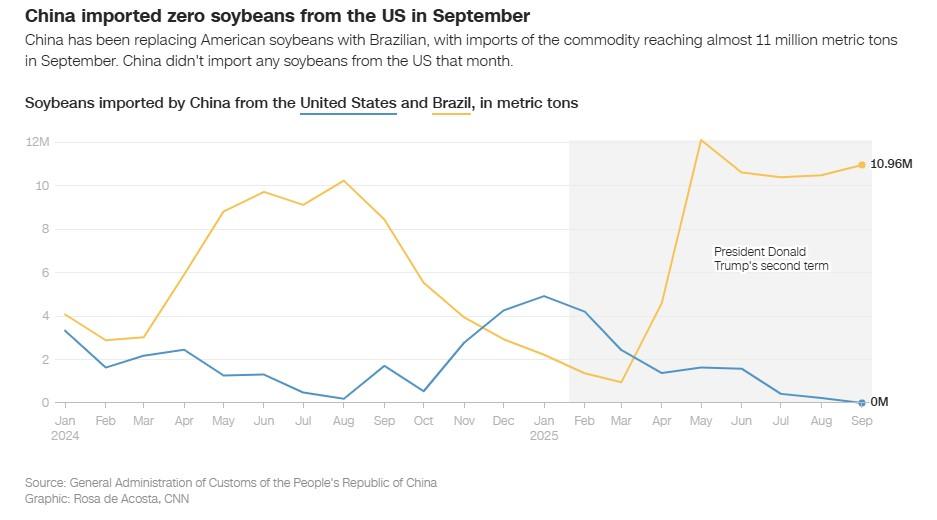 Αν και οι κινεζικές εισαγωγές αμερικανικής σόγιας μειώνονται σταθερά τους τελευταίους μήνες, για πρώτη φορά μετά από χρόνια, η Κίνα δεν εισήγαγε καθόλου σόγια από τις ΗΠΑ τον Σεπτέμβριο. Αντ’ αυτού, στράφηκε προς τη Βραζιλία και την Αργεντινή, από όπου οι αποστολές σόγιας προς την Κίνα συνεχίζουν να αυξάνονται. Τον Σεπτέμβριο, η κυβέρνηση της Αργεντινής ανέστειλε προσωρινά τον φόρο εξαγωγής σόγιας, ωθώντας την κινεζική κυβέρνηση να αγοράσει περίπου 1,2 εκατομμύρια μετρικούς τόνους από τη νοτιοαμερικανική χώρα.