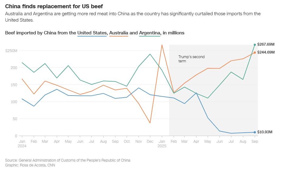 Όπως και στην περίπτωση της σόγιας, η Κίνα κάλυψε το κενό αυξάνοντας τις αγορές από άλλες χώρες, συγκεκριμένα την Αυστραλία και την Αργεντινή, αφού δεν ανανέωσε τις συμβάσεις για το βόειο κρέας με τις ΗΠΑ νωρίτερα φέτος.