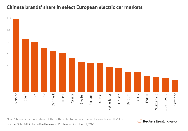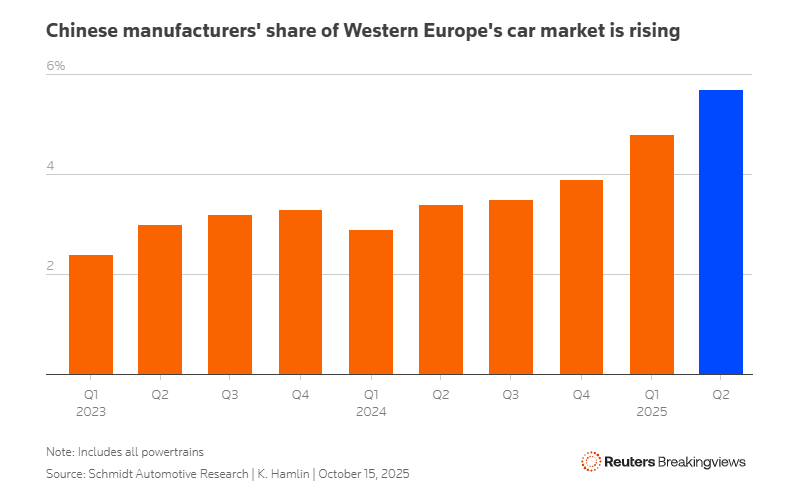 Οι δασμοί των Βρυξελλών, οι οποίοι ξεκίνησαν τον περασμένο Οκτώβριο, δεν έχουν παρουσιάσει σημαντικό εμπόδιο. Τα ηλεκτρικά οχήματα με μπαταρία κινεζικής μάρκας αύξησαν το μερίδιο αγοράς τους σε 25 αγορές της Ευρωπαϊκής Ένωσης στο 7,6% τους πρώτους οκτώ μήνες του 2025, από 7% το 2024, σύμφωνα με την JATO Dynamics. Οι αυτοκινητοβιομηχανίες στρέφονται επίσης σε άλλα συστήματα μετάδοσης κίνησης, ιδίως υβριδικά, παρακάμπτοντας τους δασμούς. Συνολικά, ο συνολικός όγκος των πωλήσεων των κινεζικών μαρκών σε αυτές τις 25 χώρες αυξήθηκε κατά 94% σε πάνω από 300.000 από τον Ιανουάριο έως τον Αύγουστο σε σχέση με την ίδια περίοδο πέρυσι, σύμφωνα με τα στοιχεία.