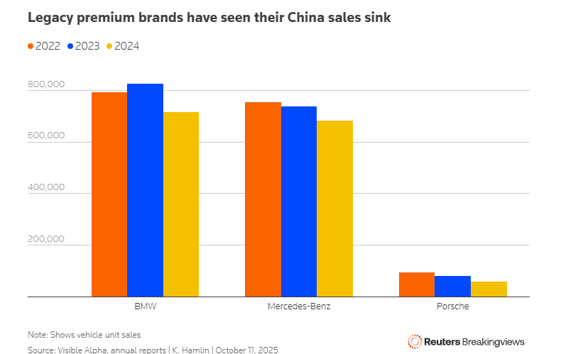 Το ίδιο το Μέσο Βασίλειο δίνει μια υπόδειξη για το τι μπορεί να συμβεί. Εκεί, η ασθενής καταναλωτική ζήτηση έχει προκαλέσει μείωση των πωλήσεων των premium brands για 19 συνεχόμενους μήνες έως τον Αύγουστο του 2025, σύμφωνα με τον Bernstein. Αλλά οι πραγματικοί χαμένοι ήταν οι παλαιότερες μάρκες. Οι παραδόσεις της Porsche στην Κίνα μειώθηκαν κατά 28% το πρώτο εξάμηνο του 2025 σε σύγκριση με ένα χρόνο νωρίτερα. Οι πωλήσεις μονάδων της Mercedes στην Κίνα μειώθηκαν κατά 14% την ίδια περίοδο, ενώ οι παραδόσεις της BMW μειώθηκαν κατά 16%. Συνολικά, ο όγκος πωλήσεων των γερμανικών μαρκών μειώθηκε κατά 7% το πρώτο εξάμηνο του έτους, ενώ οι τοπικές εταιρείες αύξησαν τον δικό τους κατά ένα τέταρτο, σύμφωνα με την Automobility.