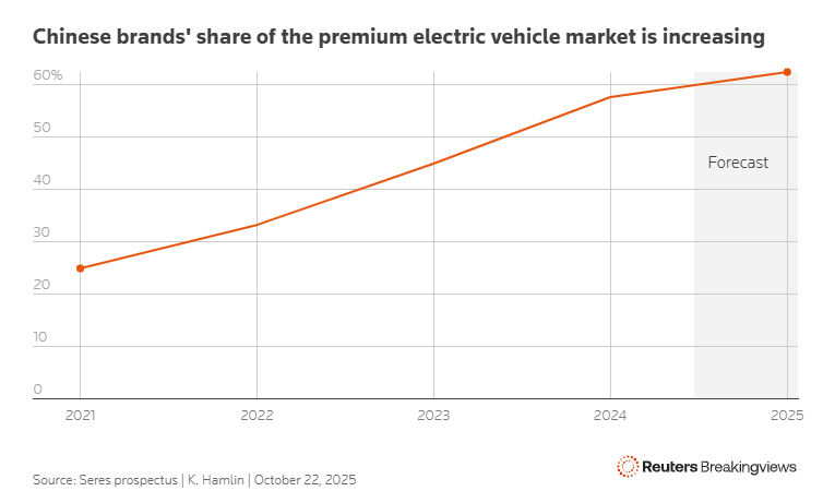 Συγκεκριμένα, οι κινεζικές μάρκες έχουν γρήγορα αποκτήσει μεγαλύτερο μερίδιο στην κατηγορία των premium EV και ήδη αντιπροσωπεύουν περισσότερο από το ήμισυ των πωλήσεων, σύμφωνα με στοιχεία της κρατικής Seres για την αρχική δημόσια προσφορά της στο Χονγκ Κονγκ. Πέρυσι, η μάρκα AITO έγινε η μάρκα με τις καλύτερες πωλήσεις στη χώρα για μοντέλα με τιμή άνω των 500.000 γιουάν (70.195,14 δολάρια), σύμφωνα με το Bloomberg.