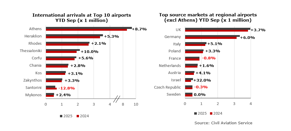 Τα 10 κορυφαία διεθνή αεροδρόμια αντιπροσώπευαν το 93% της συνολικής διεθνούς κίνησης έως τον Σεπτέμβριο. Η Θεσσαλονίκη κατέγραψε την ισχυρότερη ανάπτυξη μεταξύ αυτών με +10,0% από τον Σεπτέμβριο του 2025/24, ακολουθούμενη από την Αθήνα με +8,7% (ή +9,6% μόνο για μη κατοίκους) και την Κέρκυρα με +5,6%.