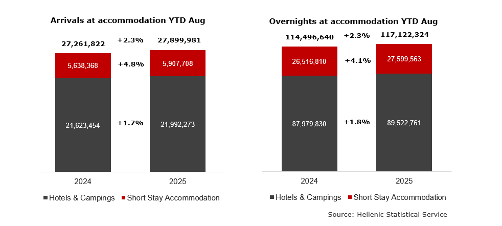 Σύμφωνα με την Ελληνική Στατιστική Αρχή, οι αφίξεις και οι διανυκτερεύσεις σε καταλύματα βραχείας διαμονής έχουν αυξηθεί με ταχύτερο ρυθμό από ό,τι στα ξενοδοχεία και κάμπινγκ, τα οποία αντιπροσωπεύουν περίπου το 79% των αφίξεων και το 76% των διανυκτερεύσεων. Στον τομέα των ξενοδοχείων και κάμπινγκ, τα κάμπινγκ αντιπροσωπεύουν λιγότερο από 2%. Η μέση διάρκεια διαμονής παρέμεινε σταθερή στις 4,1 διανυκτερεύσεις για τα ξενοδοχεία και κάμπινγκ και στις 4,7 διανυκτερεύσεις για τα καταλύματα βραχείας διαμονής.