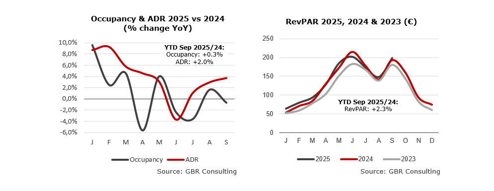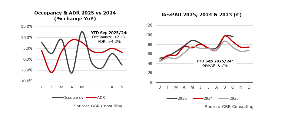 Μετά από ένα ισχυρό πρώτο τρίμηνο, η πληρότητα μειώθηκε στο δεύτερο και τρίτο τρίμηνο κατά 1,3% και 1,0% αντίστοιχα, ενώ το ADR αυξήθηκε κατά 0,9% και 2,5%. Με το RevPAR να αυξάνεται κατά 2,3% από τον Σεπτέμβριο του 2025/24, η απόδοση σταθεροποιείται φέτος μετά από αρκετά χρόνια ισχυρής ανάπτυξης.