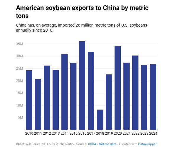 Το 2024, η Κίνα αγόρασε περίπου το 20% της σόγιας της από τις Ηνωμένες Πολιτείες, σε σύγκριση με το 41% το 2016, το έτος πριν από την πρώτη προεδρική θητεία του Τραμπ, σύμφωνα με τα τελωνειακά στοιχεία.