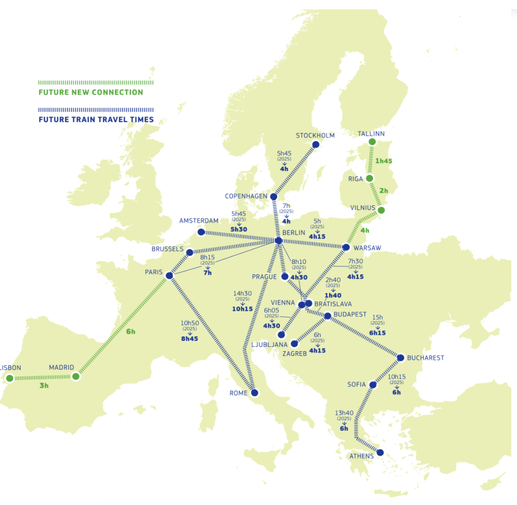 The proposed network would allow trains to reach speeds above 250km/hr, linking major European capitals and regional hubs more efficiently than ever before. By 2035, for example, travelers could journey from Athens to Sofia in just six hours, half the current time; while trains between Berlin and Copenhagen would complete the trip in four hours instead of seven. A Paris–Lisbon route via Madrid has also been planned by 2035.