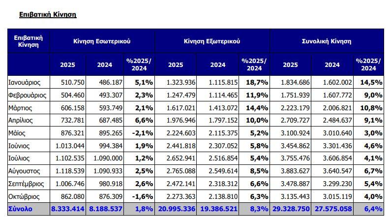 Σύμφωνα με τα επίσημα στοιχεία, η επιβατική κίνηση του αεροδρομίου της Αθήνας κατά τη διάρκεια του Οκτωβρίου 2025 ανήλθε σε 3,13 εκατ., αυξημένη κατά 4,0% σε σύγκριση με τον Οκτώβριο του 2024.