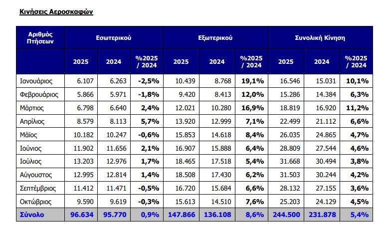 Ο αριθμός των πτήσεων στον Διεθνή Αερολιμένα Αθηνών κατά τη διάρκεια των δέκα πρώτων μηνών του 2025 ανήλθε σε 244.500, καταγράφοντας αύξηση της τάξης του 5,4% σε σχέση με το 2024.