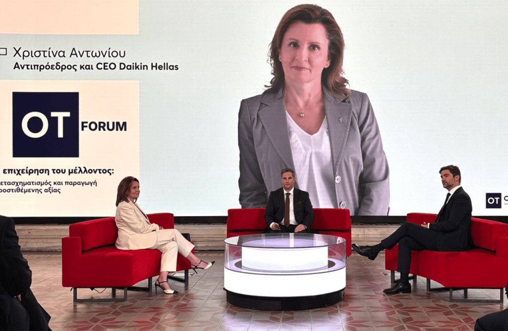 Για τις διαρθρωτικές αλλαγές και τον μετασχηματισμό που αντιμετωπίζει η αγορά του κλάδου θέρμανσης και κλιματισμού μίλησε η κα Χριστίνα Αντωνίου, αντιπρόεδρος και CEO της Daikin Hellas και πρόεδρος της Applia Hellas, στο 6ο ΟΤ FORUM και στους δημοσιογράφους Γιώργο Μανέττα και Αλέξανδρο Κλώσσα.