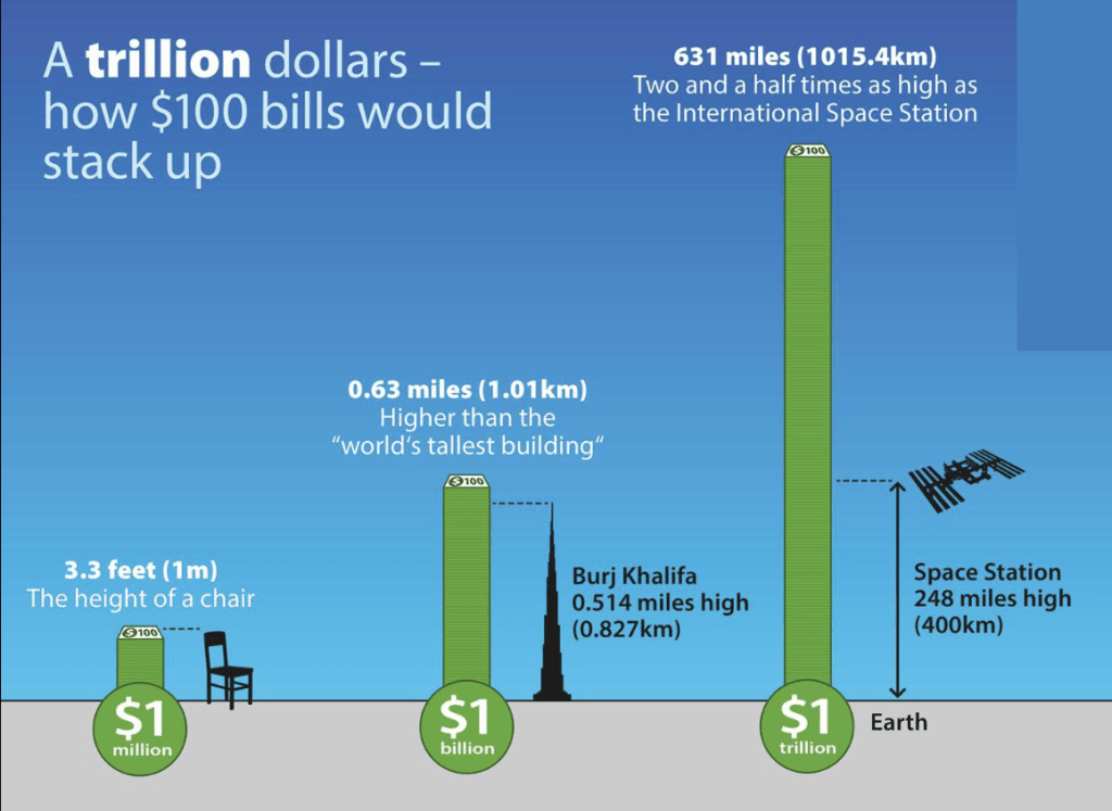 Και κάτι άλλο, αν βάζατε ένα τρισεκατομμύριο δολάρια σε ευρώ (1 δολάριο = 0.87 ευρώ) δηλαδή μόλις 870 δισεκατομμύρια, σε χαρτονομίσματα των 100 ευρώ (δηλαδή 8,7 δισεκατομμύρια χαρτονομίσματα) το ένα πάνω στο άλλο (πάχος 0,1 χιλιοστά) το συνολικό ύψος θα έφτανε τα 870 χιλιόμετρα, δηλαδή 2 και κάτι φορές το ύψος της τροχιάς του διεθνούς διαστημικού σταθμού (400 χιλιόμετρα). Σε εκατοσταδόλαρα το ύψος θα ήταν 1.015,4 χιλιόμετρα γιατί τα δολάρια είναι ελαφρώς παχύτερα (0,11 χιλλιοστά).