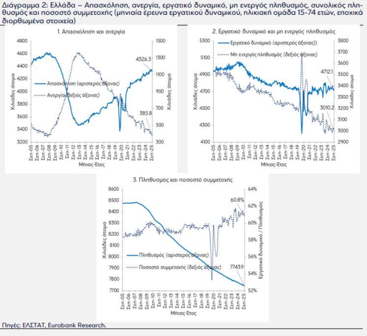 Ικανοποιητικά είναι τα στοιχεία από την πορεία της απασχόλησης και των δεικτών οικονομικού κλίματος και PMI μεταποίησης, όπως αναφέρει η Εurobank στην τελευταία έκδοσή της, 7 Ημέρες Οικονομία, ενώ αναφερόμενη στην πορεία της ανεργίας στην Ελλάδα τον Σεπτέμβριο 2025 (ΕΛΣΤΑΤ) κάνει λόγο για απόκλιση του αριθμού των ανέργων που υπολείπεται κατά 21,9 χιλ. άτομα σε σύγκριση με το ιστορικά χαμηλό επίπεδό του τον Μαϊ-08, και του αριθμού των απασχολούμενων που είναι μικρότερος κατά 294,0 χιλ. άτομα σε σχέση με το ιστορικά υψηλό επίπεδό του τον Απρ-08, γεγονός που όπως εκτιμά αποτυπώνει τη συρρίκνωση του εργατικού δυναμικού της ελληνικής οικονομίας κατά τη διάρκεια της πολυετούς κρίσης χρέους.