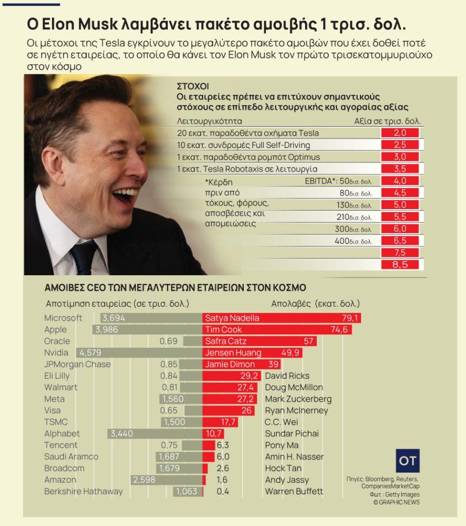 Οπως φαίνεται στο γράφημα, υπάρχουν και άλλα στελέχη μεγάλων εταιρειών -κυρίως του τεχνολογικού τομέα- που κερδίζουν εκατομμύρια δολάρια αλλά οι αποδοχές τους υπολείπονται αρκετα των σημερινών αμοιβών του CEO της Tesla… Οπως, ο διευθύνων σύμβουλος της Microsoft με περιπου 80 εκατομμυρια ευρώ και ο CEO της Apple Τιμ Κουκ με 74 εκατομμυρια δολάρια…