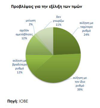 Το 64% (από 61%) των νοικοκυριών προέβλεψε άνοδο τιμών με τον ίδιο ή ταχύτερο ρυθμό και το 12% αναμένει σταθερότητα. Οι σχετικοί δείκτες σε ΕΕ και Ευρωζώνη διαμορφώθηκαν στις +22,5 και +21,9 μονάδες αντίστοιχα.