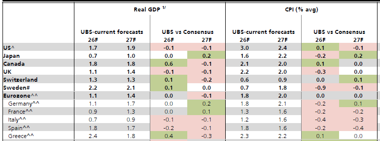 Για τον πληθωρισμό, η UBS εκτιμά ότι στην Ελλάδα θα παραμείνει πάνω από το μεσοπρόθεσμο στόχο της Ευρωπαϊκής Κεντρικής Τράπεζας, ήτοι στο 2,3% το 2026 και στο 2,2% το 2027.