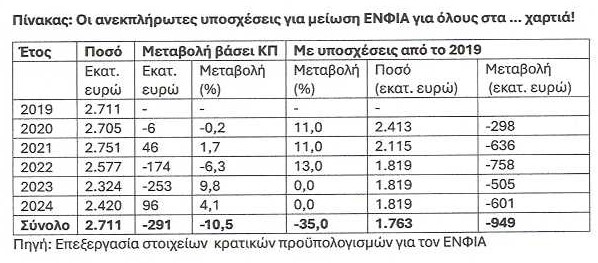 Από τον πίνακα αυτόν προκύπτει ότι αντί μείωσης του ΕΝΦΙΑ από το 2019 κατά 35% για ΟΛΟΥΣ και τη … μεσαία τάξη ή 949 εκατ. ευρώ, μειώθηκε μόνο κατά 291 εκατ. ευρώ ή κατά 10,5%! Προφανώς, αυτή μείωση προήλθε από τη γνωστή ρύθμιση χορήγησης έκπτωσης από τον ΕΝ.Φ.Ι.Α. σε φορολογούμενους φυσικά πρόσωπα που έχουν ασφαλίσει την κατοικία τους για φυσικές καταστροφές για το σύνολο της αξίας της, αλλά επιβαρύνονται, ωστόσο, από την πληρωμή αντίστοιχων ασφαλιστηρίων συμβολαίων!