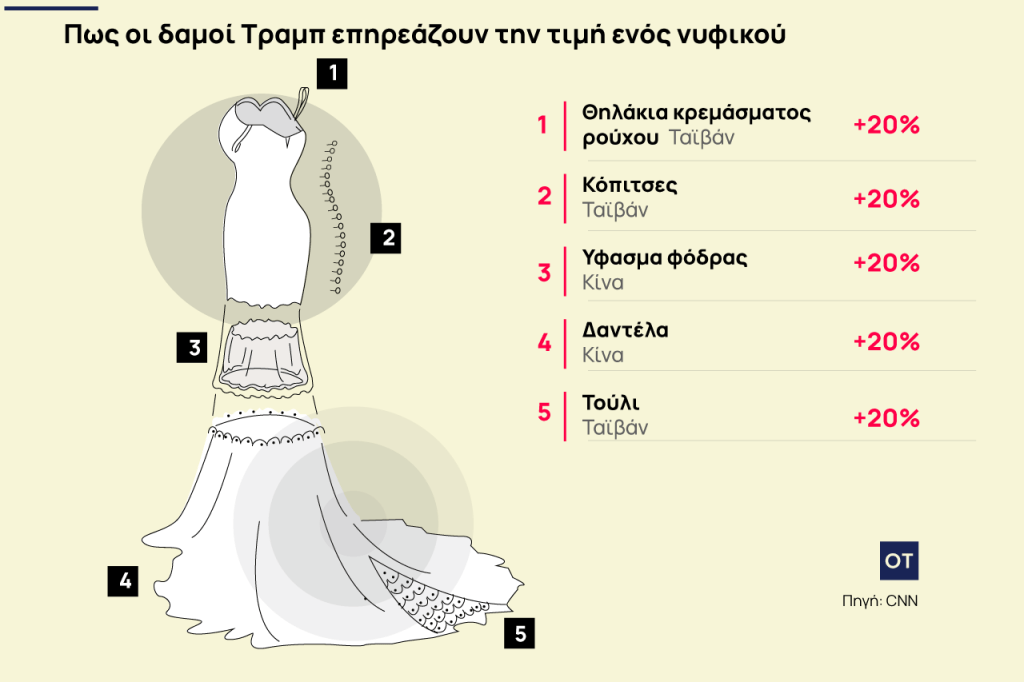 «Αυτό το φόρεμα για το οποίο συμφωνήσαμε σε μια τιμή με το κατάστημα ξαφνικά μας κοστίζει 30%, 40% περισσότερο», δήλωσε στο αμερικανικό μέσο ο Τζάστιν Αλεξάντερ, πρόεδρος της μάρκας νυφικών Justin Alexander.