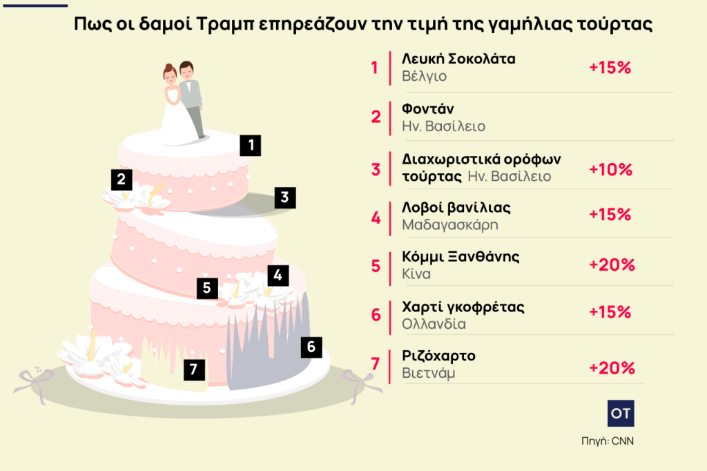 Η εμπορική ατζέντα του Τραμπ δεν βοηθά το μέσο κόστος ενός γάμου στις ΗΠΑ, το οποίο είχε ήδη αυξηθεί κατά 18% στα 33.000 δολάρια τα τελευταία πέντε χρόνια, σύμφωνα με την παγκόσμια πλατφόρμα σχεδιασμού γάμων και προμηθευτών The Knot. Με δασμολογικούς συντελεστές που φτάνουν έως και το 50% για ορισμένες χώρες, αναμένεται αύξηση του κόστους.