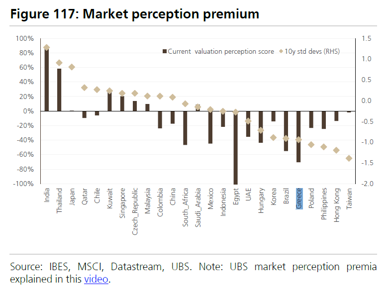 Η UBS εξηγεί ότι το «market perception premium» μετρά τη διαφορά ανάμεσα στις τρέχουσες αποτιμήσεις και το μέσο επίπεδο της τελευταίας δεκαετίας. Όσο πιο αρνητικό είναι το σκορ, τόσο περισσότερο θεωρείται ότι μια αγορά παραμένει υποτιμημένη σε σχέση με τα θεμελιώδη μεγέθη της.