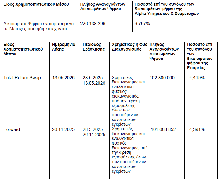 Υπό την αίρεση εξασφάλισης των απαιτούμενων εποπτικών εγκρίσεων, η UniCredit δύνανται να οδηγήσουν στην απόκτηση επιπλέον 5.859.978 κοινών μετοχών με δικαίωμα ψήφου, που αντιστοιχούν στο 0,253% του συνόλου των δικαιωμάτων ψήφου της Alpha Bank. Το συνολικό ποσοστό θα ανέλθει στο 29,794% της Alpha Bank.